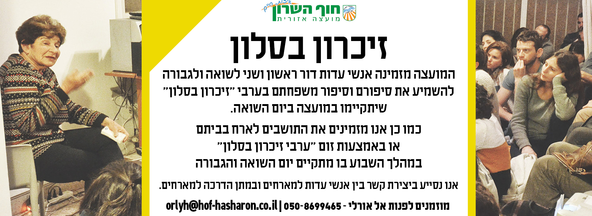 אנשי עדות יוזמנו להתארח בסלון באחד מיישובי המועצה האזורית חוף השרון במהלך השבוע בו מתקיימים אירועי יום השואה והגבורה (12-18.4.26). אנו נתאם עם המארחים את היום והשעה ונדאג לכך שאנשי העדות יוסעו למפגש במידת הצורך. מדובר בעדות של חצי שעה עד שעה, מול קהל של כ- 15-40 איש המגיעים במיוחד בכדי לשמוע את העדות ולשוחח.