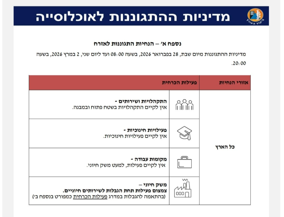 המדיניות בתוקף החל מיום שבת, 28 בפברואר 2026, בשעה 08:00 ועד ליום שני, 2 במרץ 2026, בשעה 20:00.